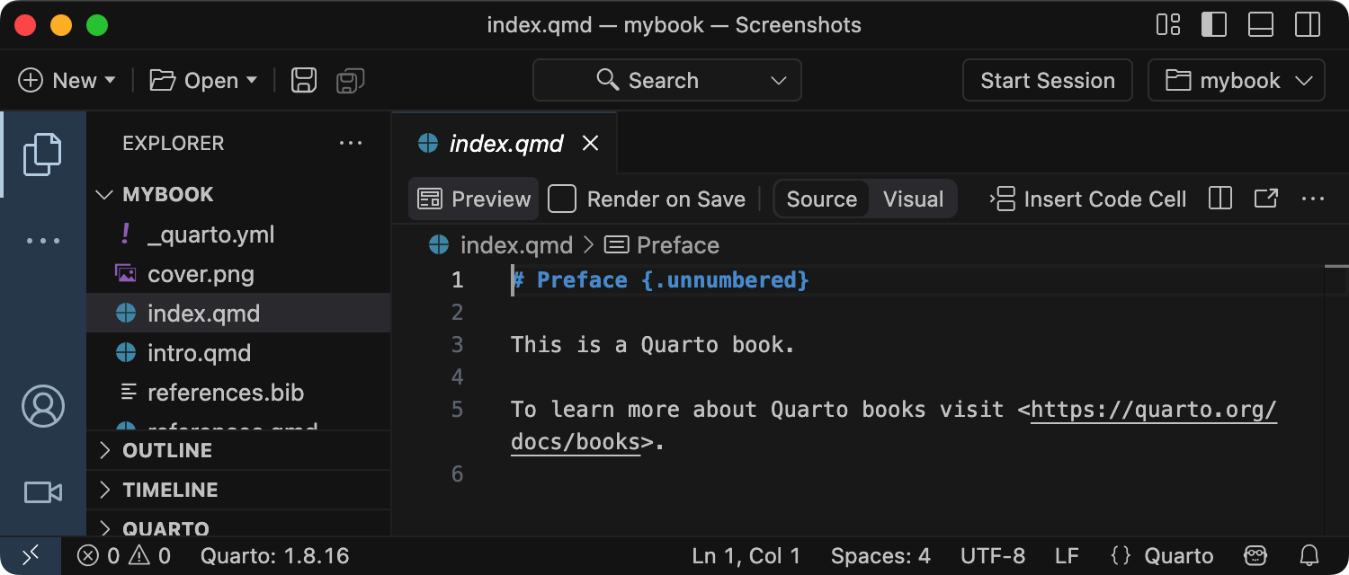 Quarto Books are combinations of multiple documents (chapters) into a single manuscript. Books can be created in a variety of formats: