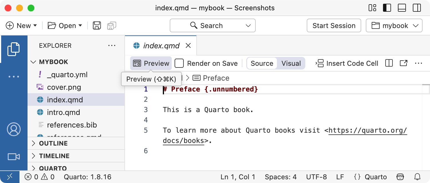 The new book project will be created and opened within VS Code. Click the Preview button () to preview the book: